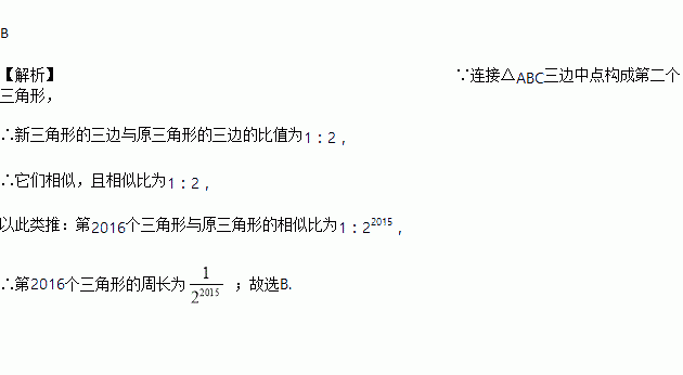 已知△ABC的周长为1,连结△ABC的三边中点构成第二个三角形,再连结第二个三角形的三边中点构成第三个三角形,依此类推,第2016个三角形的周长是( )
