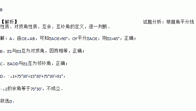 如图,直线AB,CD相交于点O,OE⊥AB于点O,OF平分∠AOE,∠1=15°30′,则结论中不正确的是( )