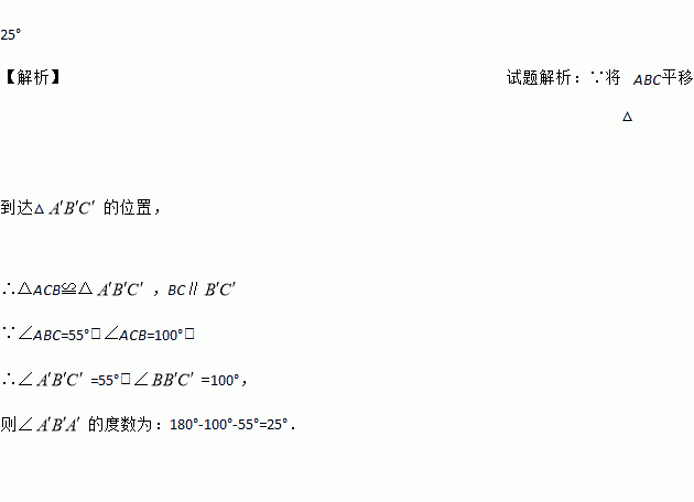 如图,将△ABC平移到△A′B′C′的位置(点B′在AC边上),若∠B=55°,∠C=100°,则∠AB′A′的度数为________________°