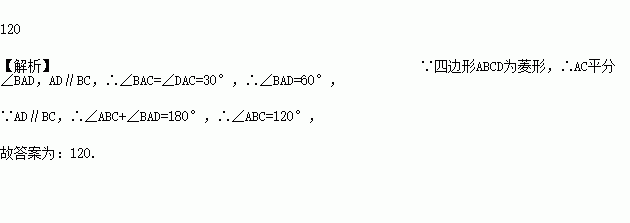 如图,在菱形ABCD中,∠BAC=30°,则∠B=______度.
