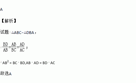 A. AB2=BC•BD B. AB2=AC•BD C. AB•AD=BC•BD D. AB•AC=AD•BC
