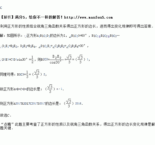 在平面直角坐标系中,正方形A1B1C1D1、D1 E1E2B2、A2B2 C2D2、D2E3E4B3…按如图所示的方式放置,其中点B1在y轴上,点C1、E1、E2、C2、E3、E4、C3…在x轴上,已知正方形A1B1C1D1的边长为l,∠B1C1O=60°,B1C1∥B2C2∥B3C3…,则正方形A2017B2017C2017 D2017的边长是( )
