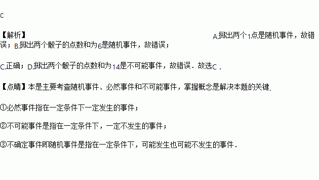 C. 掷出两个6点是随机事件 D. 掷出两个骰子的点数和为14是随机事件