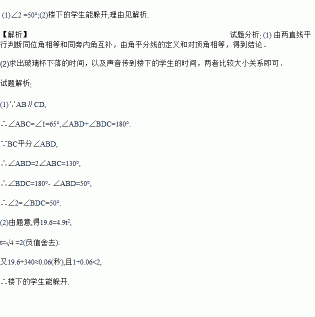 (2)自由下落的物体的高度h(米)与下落时间t(秒)的关系为h=4.9t2.有一学生不慎把一个玻璃杯从19.6米高的楼上掉下,刚好另有一学生站在与下落的玻璃杯同一直线的地面上,在玻璃杯下落的同时楼上的学生惊叫一声.则这时楼下的学生能躲开吗?(学生反应时间为1秒,声音的传播速度为340米/秒)