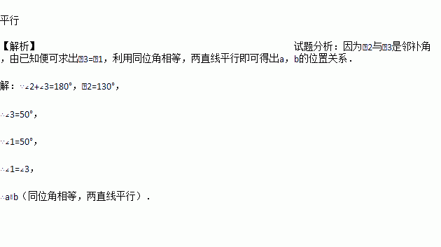如图,两直线a、b被第三条直线c所截,若∠1=50°,∠2=130°,则直线a、b的位置关系是 .