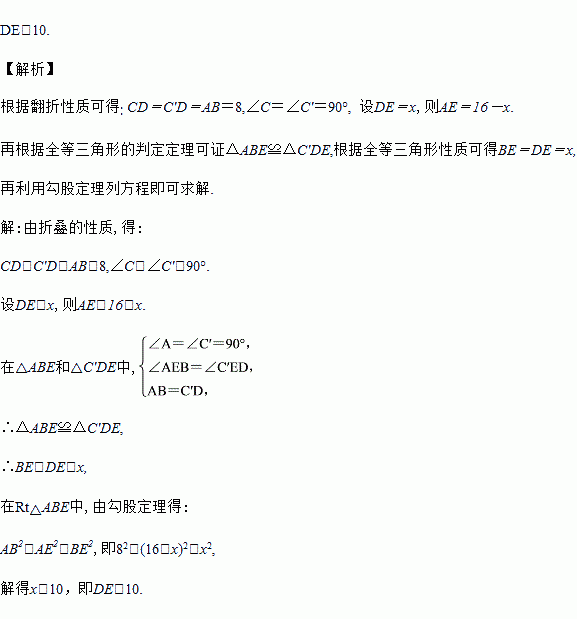 如图所示,将长方形ABCD沿直线BD折叠,使点C落在点C′处,BC′交AD于点E,AD=16,AB=8,求DE的长.