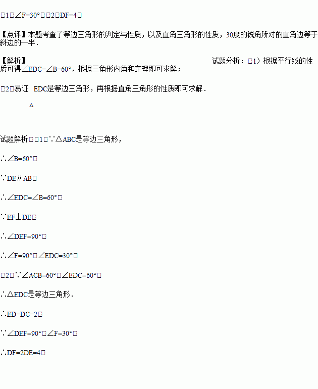 如图,在等边三角形ABC中,点D,E分别在边BC,AC上,且DE∥AB,过点E作EF⊥DE,交BC的延长线于点F.