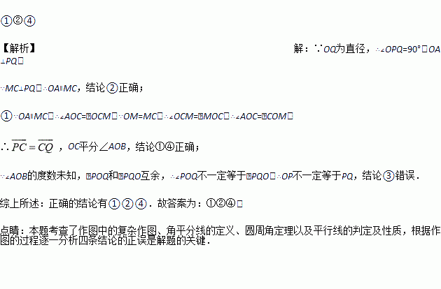 则下列判断:①弧CQ=弧PC;②MC∥OA;③OP=PQ;④OC平分∠AOB,