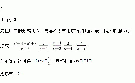 求分式(x-2-)÷的值,其中x取不等式组的整数解.