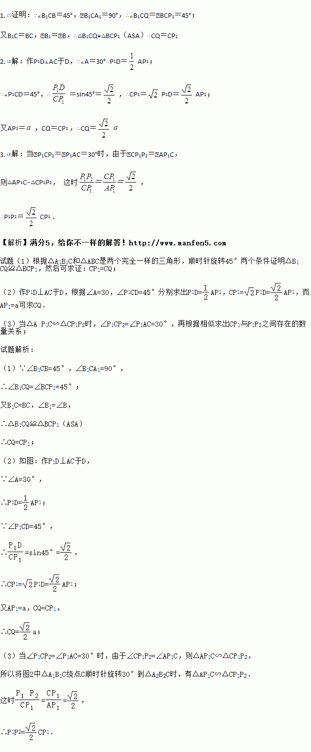 (1)将图1中△A1B1C绕点C顺时针旋转45°得图2,点P1是A1C与AB的交点,点Q是A1B1与BC的交点,求证:CP1=CQ;