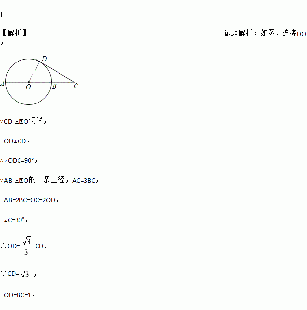 已知,AB是⊙O的一条直径,延长AB至C点,使AC=3BC,CD与⊙O相切于D点,若CD=,则⊙O半径的长为 .