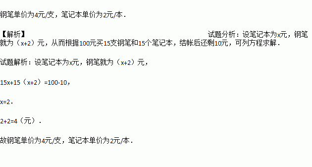 售货员:100元钱够用.每支钢笔比每个笔记本贵2元,结帐后还剩10元.