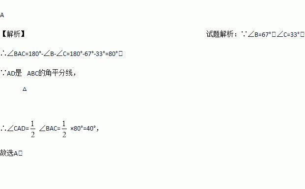 在△ABC中,∠B=67°,∠C=33°,AD是△BAC的角平分线,则∠CAD的度数为( )