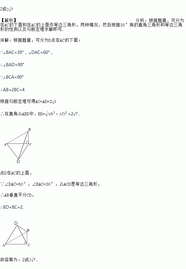 如图,在Rt△ABC中,∠ACB=90°,∠BAC=30°,BC=2,在同一平面内,以AC为一边作等边△ACD,连接BD,则BD= ______.