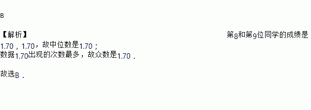 B 【解析】第8和第9位同学的成绩是1.70,1.70,故中位数是1.70; 数据1.70出现的次数最多,故众数是1.70. 故选B.