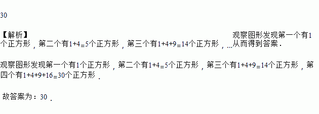 如图,每一幅图中均含有若干个正方形,第1幅图中有1个正方形;第2幅图中有1+4=5个正方形;第三幅图中有1+4+9=14个正方形;…按这样的规律下去,第4幅图中有_______个正方形.
