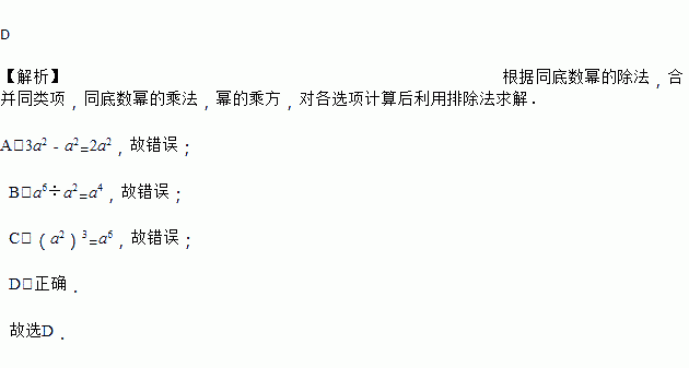 A. 3a2﹣a2=3 B. a6÷a2=a3 C. (a2)3=a5 D. a2•a3=a5