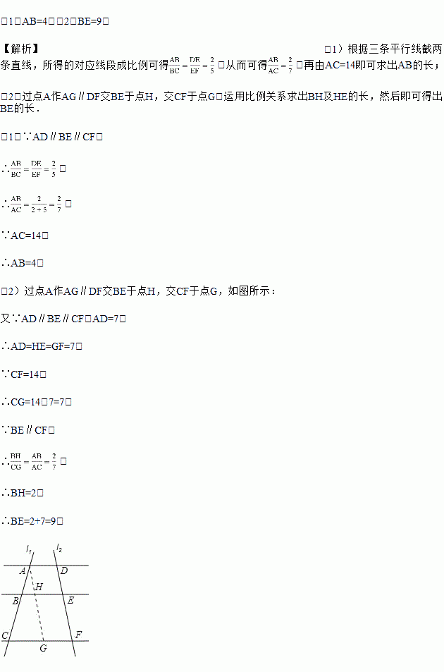 如图,已知AD∥BE∥CF,它们以此交直线l1、l2于点A、B、C和D、E、F.若,AC=14,