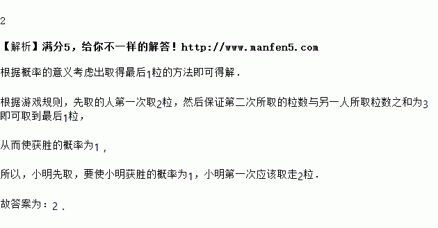 小明和小颖按如下规则做游戏:桌面上放有粒豆子,每次取粒或粒,由小明先取,最后取完豆子的人获胜.要使小明获胜的概率为,那么小明第一次应该取走________粒.