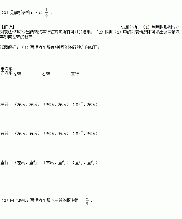 (1)请用“树形图”或“列表法”列举出这两辆汽车行驶方向所有可能的结果;