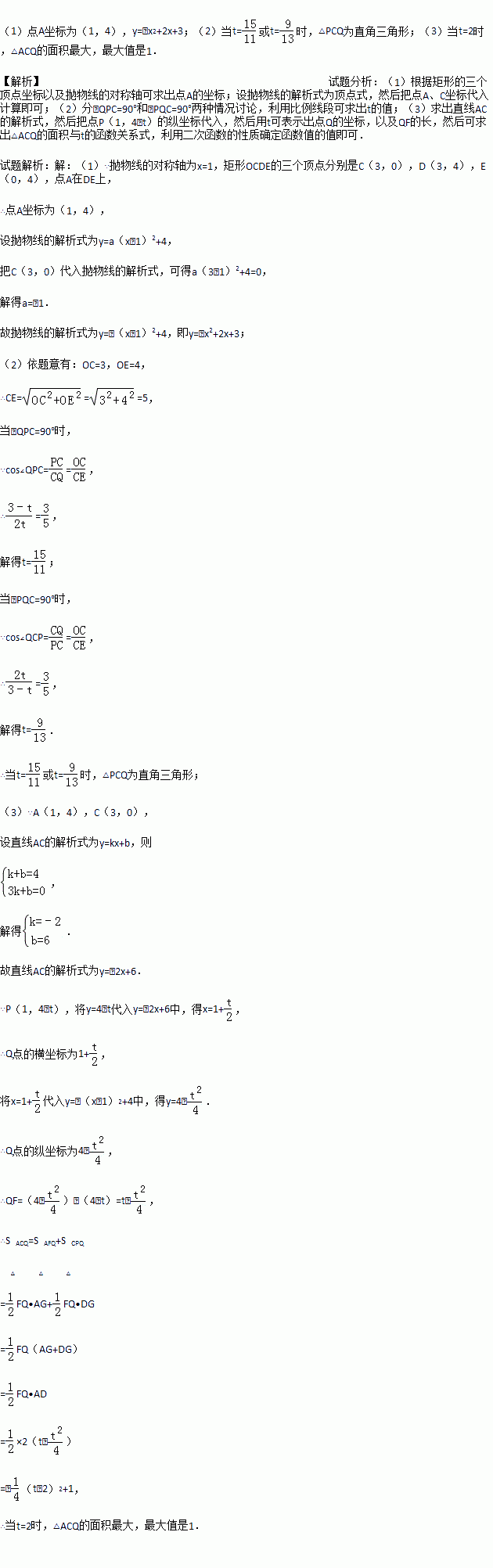 如图,在平面直角坐标系中,矩形OCDE的三个顶点分别是C(3,0),D(3,4),E(0,4).点A在DE上,以A为顶点的抛物线过点C,且对称轴x=1交x轴于点B.连接EC,AC.点P,Q为动点,设运动时间为t秒.