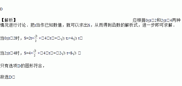 如图,菱形ABCD的边长是4厘米,∠B=60°,动点P以1厘米/秒的速度自A点出发沿AB方向运动至B点停止,动点Q以2厘米/秒的速度自B点出发沿折线BCD运动至D点停止.若点P、Q同时出发运动了t秒,记△BPQ的面积为S厘米2,下面图象中能表示S与t之间的函数关系的是( )