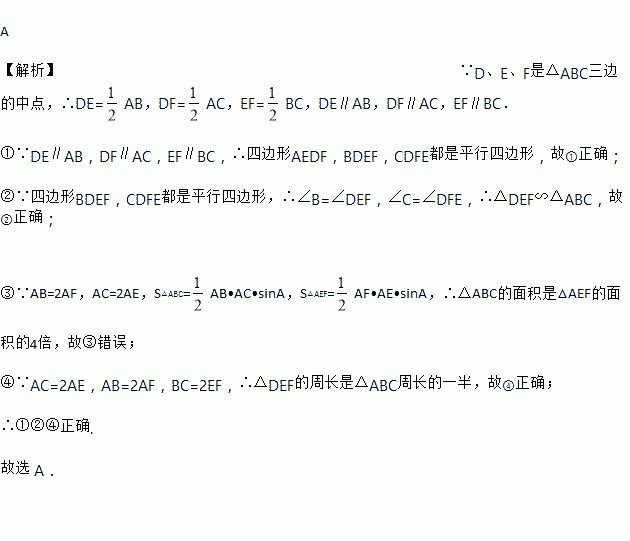 A 【解析】∵D、E、F是△ABC三边的中点,∴DE=AB,DF=AC,EF=BC,DE∥AB,DF∥AC,EF∥BC. ①∵DE∥AB,DF∥AC,EF∥BC,∴四边形AEDF,BDEF,CDFE都是平行四边形,故①正确; ②∵四边形BDEF,CDFE都是平行四边形,∴∠B=∠DEF,∠C=∠DFE,∴△DEF∽△ABC,故②正确; ③∵AB=2AF,AC=2AE,S△A...