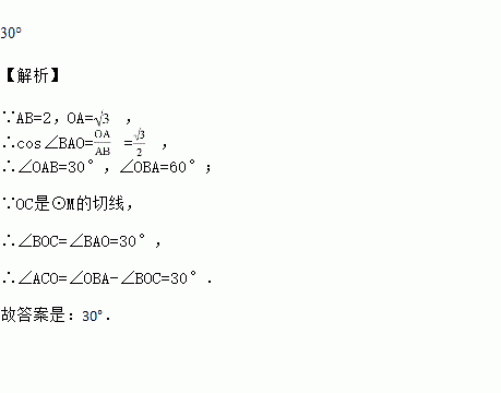 已知,如图,半径为1的⊙M经过直角坐标系的原点O,且与x轴、y轴分别交于点A、B,点A的坐标为( , 0 ),⊙M的切线OC与直线AB交于点C.则∠ACO=________.