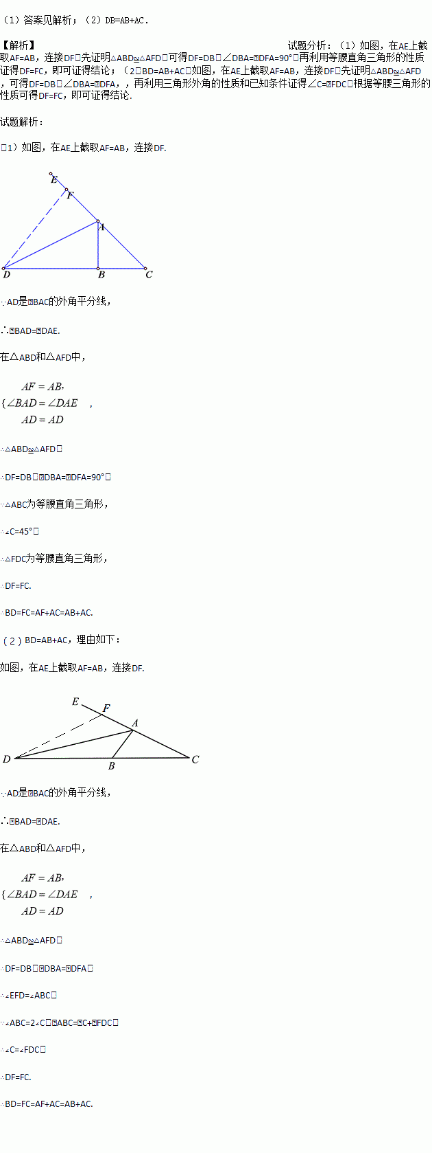 (1) 已知:如图1,等腰直角三角形ABC中,∠B=90°,AD是∠BAC的外角平分线,交CB边的延长线于点D.