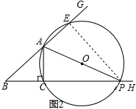 (3)若AP平分∠GAC,⊙O交射线BG于E,请在图2中,画出符合条件的⊙O,并确定此时BP的值.