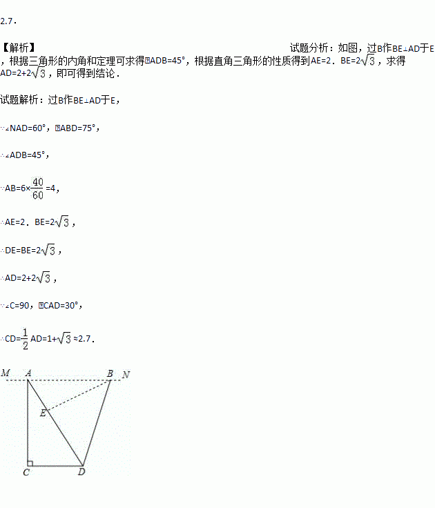 如图,地面上两个村庄C、D处于同一水平线上,一飞行器在空中以6千米/小时的速度沿MN方向水平飞行,航线MN与C、D在同一铅直平面内.当该飞行器飞行至村庄C的正上方A处时,测得∠NAD=60°;该飞行器从A处飞行40分钟至B处时,测得∠ABD=75°.求村庄C、D间的距离(