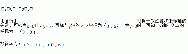 (3,0) (0,6) 【解析】根据一次函数和坐标轴的关系,可知当x=0时,y=6,可知与y轴的交点坐标为(0,6),当y=0时,可知与x轴的交点的坐标为:(3,0). 故答案为:(3,0),(0,6).