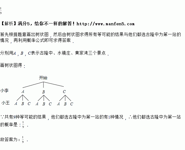 小李和小王准备到古隆中、水镜庄、黄家湾三个景点去游玩,如果他们各自在这三个景点中任选一个作为游玩的第一站(每个景点被选为第一站的可能性相同),那么他们都选古隆中为第一站的概率是________.