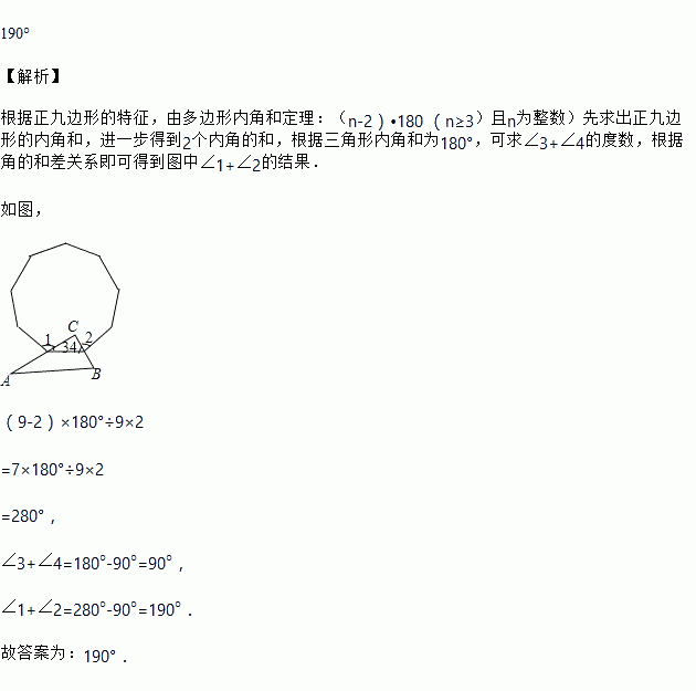 如图,直角三角形ABC的两条直角边AC,BC分别经过正九边形的两个顶点,则图中∠1+∠2的度数是________.