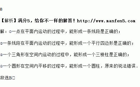下列说法:①一点在平面内运动的过程中,能形成一条线段;②一条线段在平面内运动的过程中,能形成一个平行四边形;③一个三角形在空间内运动的过程中,能形成一个三棱柱;④一个圆形在空间内平移的过程中,能形成一个球体.其中正确的是( )