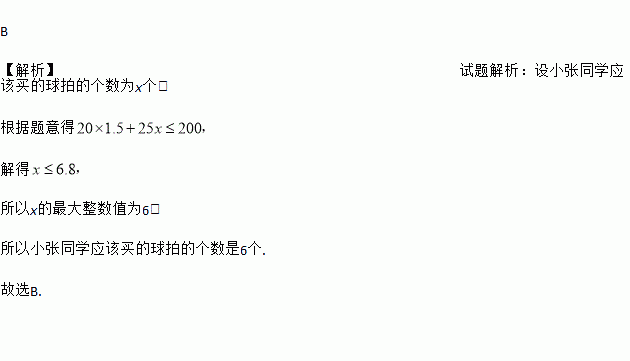 为了举行班级晚会,小张同学准备去商店购买20个乒乓球做道具,并买一些乒乓球拍做奖品.已知乒乓球每个1.5元,球拍每个25元,如果购买金额不超过200元,且买的球拍尽可能多,那么小张同学应该买的球拍的个数是( )
