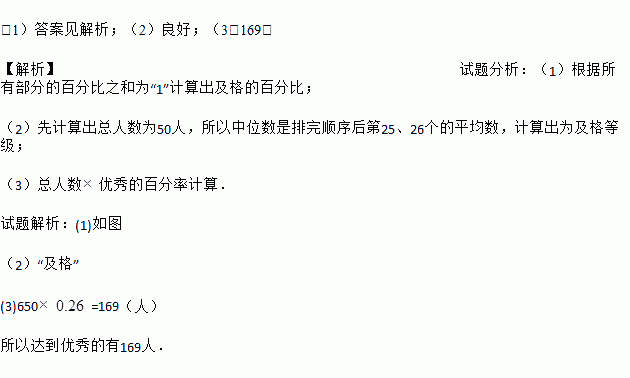 (1)答案见解析;(2)良好;(3)169. 【解析】试题分析:(1)根据所有部分的百分比之和为“1”计算出及格的百分比; (2)先计算出总人数为50人,所以中位数是排完顺序后第25、26个的平均数,计算出为及格等级; (3)总人数优秀的百分率计算. 试题解析:(1)如图 (2)“及格” (3)650=169(人) 所以达到优秀的有169人.