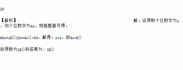 28 【解析】【解析】 设原数十位数字为x,则个位数字为4x,根据题意可得: 40x+x﹣(10x+4x)=54,解得:x=2,故4x=8. 故原数为28.故答案为:28.