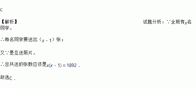 某班同学毕业时,都将自己的照片向全班其他同学各送一张表示留念,全班共送1892张照片,如果全班有x名同学,根据题意,列出方程为( )