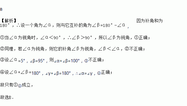 B ¡¾½âÎö¡¿ÒòΪ²¹½ÇºÍΪ180¡ã£¬¡àÉèÒ»¸ö½ÇΪ¡Ï¦Á£¬ÔòÓëËü»¥²¹µÄ½ÇΪ¡Ï¦Â=180¡ã-¡Ï¦Á£¬ ¢Ùµ±¡Ï¦ÁΪÈñ½Çʱ£¬¡Ï¦Á£¼90¡ã£¬¡à¡Ï¦Â£¾90¡ã£¬ËùÒԡϦÂΪ¶Û½Ç£¬¢ÙÕýÈ·£» ¢ÚͬÀí£¬Èô¡Ï¦ÁΪ¶Û½Ç£¬ÔòËüµÄ²¹½Ç¡Ï¦ÂΪÈñ½Ç£¬¡Ï¦Â£¼¡Ï¦Á£¬¢Ú²»ÕýÈ·£» ¢ÛÉè¡Ï¦Á=5¡ã£¬¡Ï¦Â=95¡ã£¬Ôò¡Ï¦Á+¡Ï¦Â=100¡ã£¬¢Û²»ÕýÈ·£» ¢ÜÉè¡Ï¦Á+¡Ï¦Â=180¡ã£¬¡Ï¦Ã+¡Ï¦Â=180¡ã£¬¡à¡Ï¦Á=¡Ï¦Ã£¬¢ÜÕýÈ·£»...