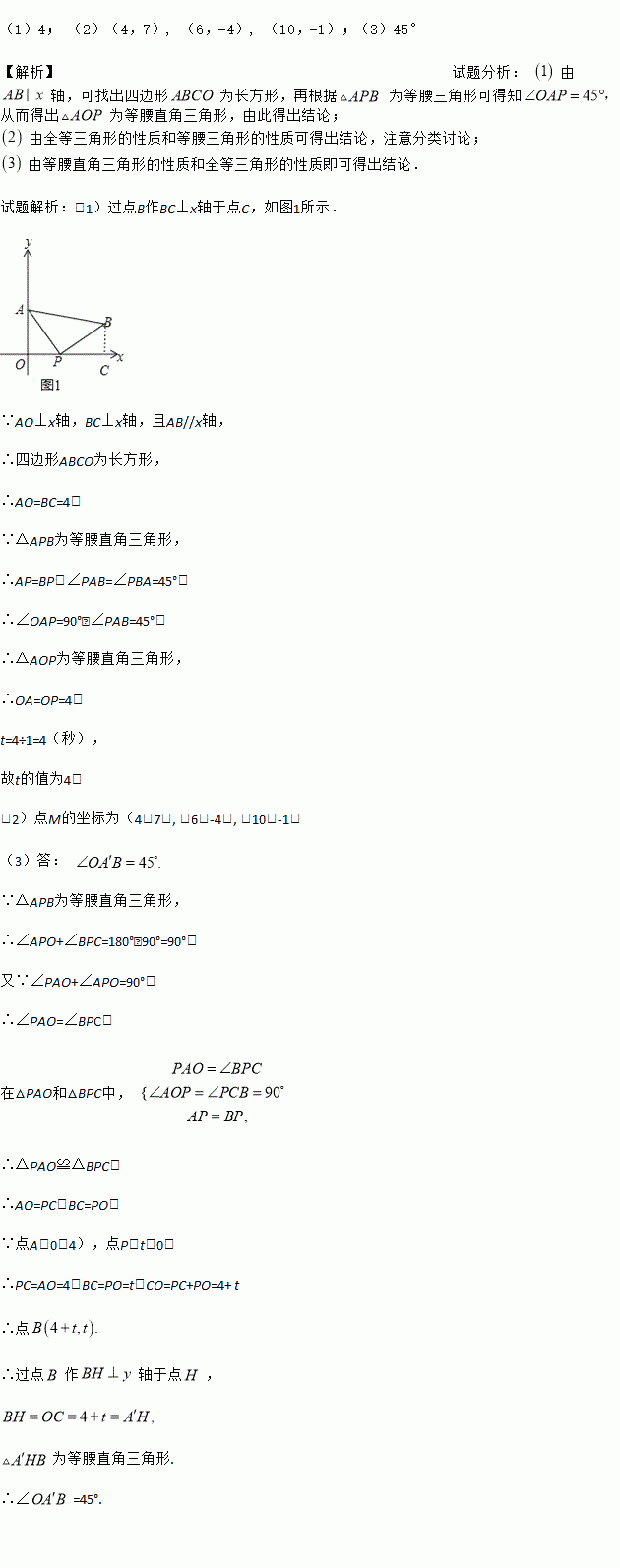 如图,A(0,4)是直角坐标系y轴上一点,动点P从原点O出发,沿x轴正半轴运动,速度为每秒1个单位长度,以P为直角顶点在第一象限内作等腰Rt△APB.设P点的运动时间为t秒.