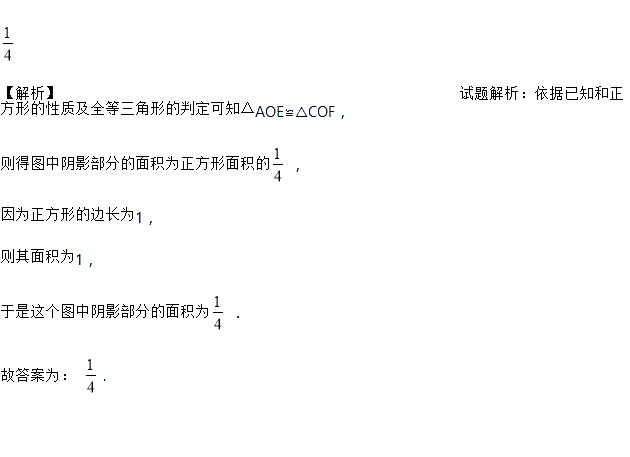 如图,已知面积为1的正方形ABCD的对角线相交于点O,过点O任作一条直线分别交AD,BC于E,F,则阴影部分的面积是________________.