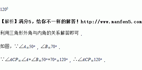 P为△ABC中BC边的延长线上一点,∠A=50°,∠B=70°,则∠ACP=________.