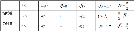 | 绝对值 | 2.5 | $\sqrt{7}$ | $\root{3}{8}$ | $\sqrt{17}$ | $\sqrt{3}$-1.7 | $\sqrt{3}$-$\frac{π}{2}$ |