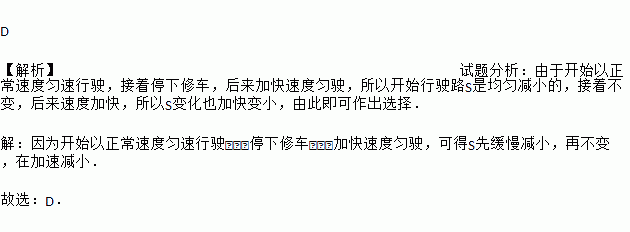 (2015•菏泽)小明骑自行车上学,开始以正常速度匀速行驶,但行至中途自行车出了故障,只好停下来修车,车修好后,因怕耽误上课,加快了骑车速度,下面是小明离家后他到学校剩下的路程s关于时间t的函数图象,那么符合小明行驶情况的图象大致是( )