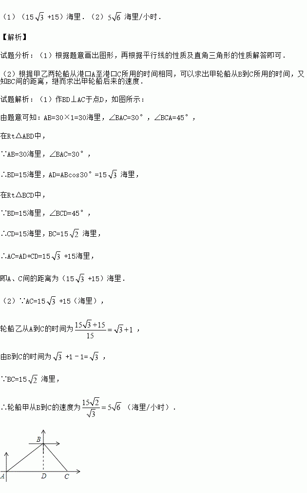 甲、乙两条轮船同时从港口A出发,甲轮船以每小时30海里的速度沿着北偏东60°的方向航行,乙轮船以每小时15海里的速度沿着正东方向行进,1小时后,甲船接到命令要与乙船会合,于是甲船改变了行进的速度,沿着东南方向航行,结果在小岛C处与乙船相遇.假设乙船的速度和航向保持不变,求: