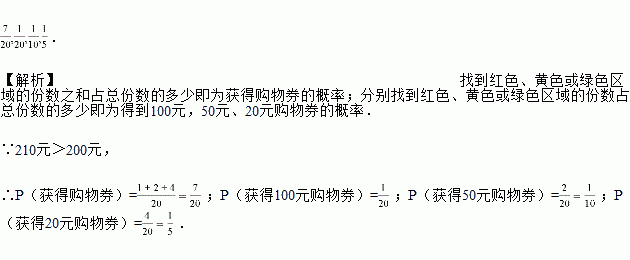 Ôª£¬¾ÍÄÜ»ñµÃÒ»´Îת¶¯×ªÅ̵Ļú»á£¬Èç¹ûתÅÌÍ£Ö¹ºó£¬Ö¸ÕëÕýºÃ¶Ô×¼ºì¡¢»Æ»òÂÌÉ«ÇøÓò£¬¹Ë¿Í¾Í¿ÉÒÔ·Ö±ð»ñµÃ 100 Ôª¡¢ 50 Ôª¡¢ 20 ÔªµÄ¹ºÎïȯ£®Ä³¹Ë¿ÍÏû·Ñ 210 Ôª£¬Ëûת¶¯×ªÅÌ»ñµÃ¹ºÎïȯµÄ¸ÅÂÊÊǶàÉÙ?ËûµÃµ½ 100 Ôª¡¢ 50 Ôª¡¢ 20 Ôª¹ºÎïȯµÄ¸ÅÂÊ·Ö±ðÊǶàÉÙ?