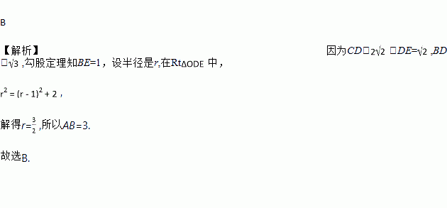 如图所示,弦CD垂直于⊙O的直径AB,垂足为E,且CD=,BD=,则AB的长为 ( )