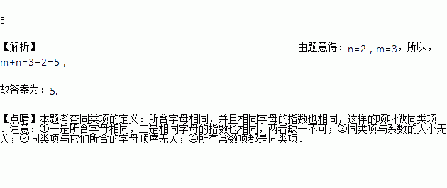 若单项式2x2ym与-xny3是同类项,则m+n的值是______.
