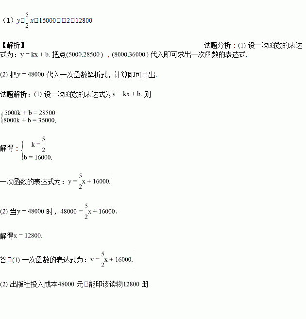 (1)若这种读物的投入成本y(元)是印数x(册)的一次函数,求这个一次函数的表达式(不要求写出x的取值范围).